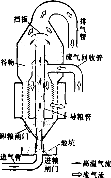 图3 循环式干燥机 柱式干燥机一种高温快速横流型连续流动式干燥机,结构如图4。立柱形干燥室的柱壁由两层编织或冲孔筛网或折流板组成,分上、下两段,上部为干燥段,下部为冷却段(烘稻谷时不用冷却段)。工作时,谷物靠自重在柱壁间下流,柱体底部装有卸粮轮,改变卸粮轮的转速可以控制物料在柱体内停留时间。在柱体内还装有谷物换向器,以改善柱体内外壁谷物干燥的均匀性。为了充分利用热能,还可将干燥段下部及冷却段全部废气重新回收到热风机的吸气口,废气回收量最多可达热风机进气量的2/3。柱式干燥机的优点是生产率高,干燥质量好,机械化程度高。但需要配置装卸设备,价格较昂贵。 塔式干燥机 与柱式干燥机的不同在于干燥室内装的是许多横向配置的角状管通气道(管道下方敞开)。谷物由干燥机顶部喂入烘干塔,靠自重向下流动,由风机送来的热气流分散进入各进气角管,从管底逸出进入谷物流动层加热谷物并汽化谷物水分,然后经排气角管由抽风机排出。向下流动的谷物从谷层进气角管和排气角管之间流过,接触加热气流获得干燥,进入干燥室下部的冷却段冷却,再由卸料装置卸出。