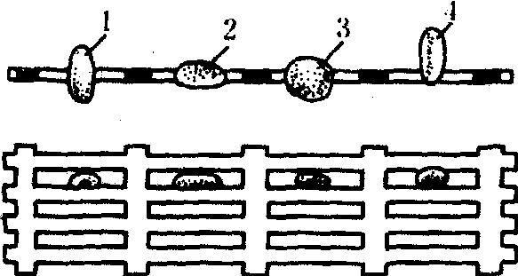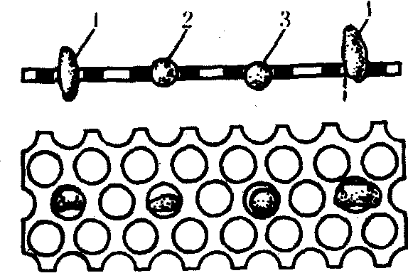 图4 长方孔筛清选谷粒的原理 1、2、3.谷粒厚度小于筛孔宽度(能通过筛孔);4.谷粒厚度大于筛孔宽度(通不过筛孔) 按种子长度分选,可采用窝眼筒和窝眼盘精选机。窝眼筒(图5)由内壁有圆形窝眼的圆筒和承种槽组成。工作时,圆筒作旋转运动,长度小于窝眼口径的谷粒落入窝眼内,随圆筒旋转上升到一定高度,落入承种槽中,随即由螺旋推运器运出机外;长度大于窝眼口径的谷粒,沿筒壁轴向移动,最后由滚筒的另一端排出。承种槽边缘位置可以根据分离效果调整。窝眼筒转速不可过高(一般30~40转/分),以防由于离心力的作用,谷粒不能自窝眼内掉出,影响分离质量。此工序通常安排在筛选之后。窝眼盘精选机是由一组带有窝眼的圆盘,它们按一定间隔安放在水平轴上,窝眼盘旋转时,长度小的谷粒掉入窝眼内,被带到一定高度后排入排料槽中;长度较大的谷粒不能被窝眼提升,通过机器输送到另一端,从而把谷粒分成两级。