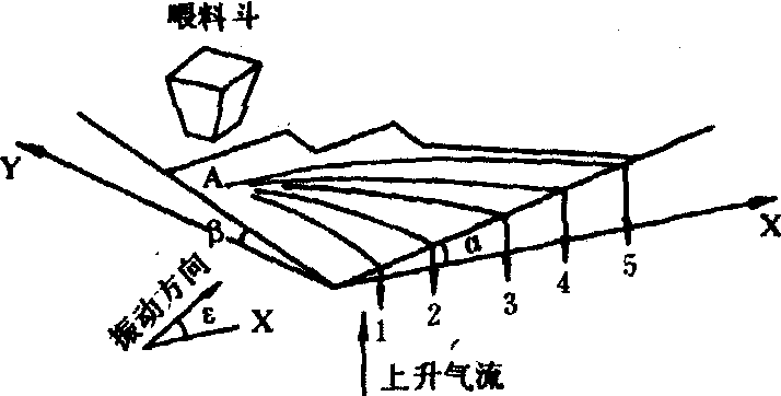 图5 窝眼筒按长度分选 按种子比重分选方法较多,广泛采用的是重力精选机。重力精选机对尺寸相同、而比重不同的谷粒分选效果明显。因此,重力精选须在其他清选和按种子尺寸精选后进行。重力精选机是综合气流和振动等原理,按比重进行分离。有吹气式和吸气式两种。吸气式重力精选机由分级台、吸风管、风机、喂入装置和驱动机构等组成。分级台面(图6)为一个双向倾斜振动筛面,α角为纵向倾角,β角为横向倾角。分级台由振动电机(或曲柄连杆机构)驱动。分选过程是,谷粒由喂入装置落入筛面,在振动筛面上逐步形成薄层,同时,由风机产生的气流,按一定的方向,由下而上通过筛面和谷层,使谷粒处于沸腾状态,在垂直方向分层,谷粒的比重大者沉下,轻者浮上,临界速度低于气流速度的轻谷粒悬浮在谷层上部,很少、甚至不和台面接触,类似流体,在自身重力分力的作用下,朝着台面最低点运动,沿出料边的最低部位排出。重谷粒由于处于下层,受到纵向振动的作用,被向上推送,最重的砂石粒将运动到出料边的最高部位被排出。