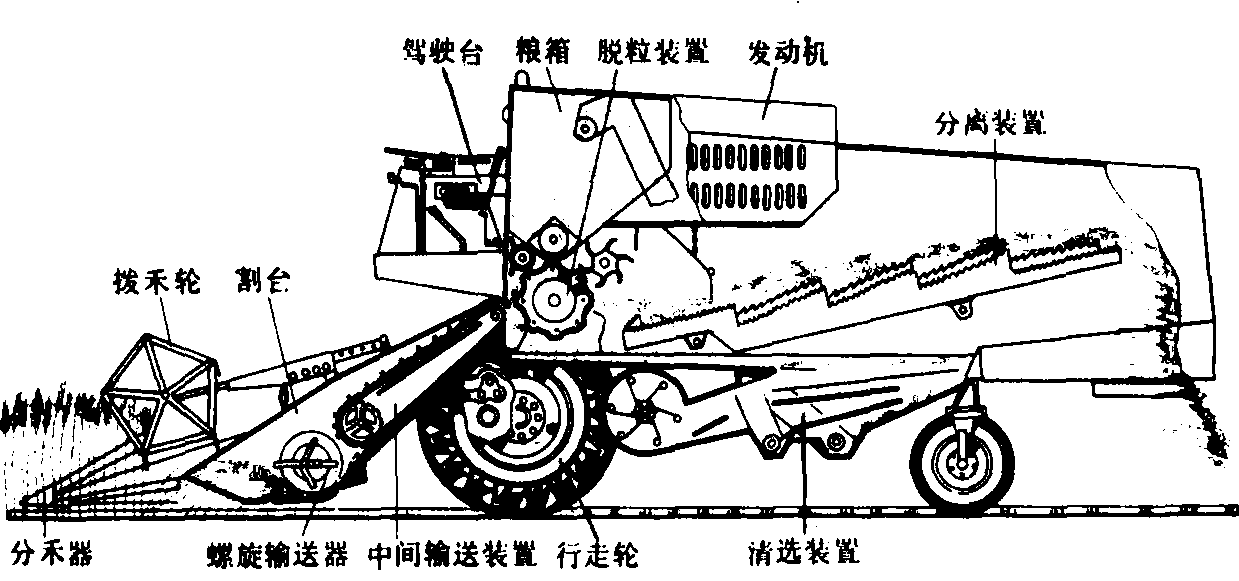 图1 牵引式联合收割机(全喂入型) 自带的发动机传动)。收割前,需由别的机器或人工割出第一圈拖拉机行走的通道。结构比自走式联合收割机简单,价格便宜,使用要求较低,在联合收割机的早期发展中其数量占主要地位。由于受拖拉机动力限制,早期多为小型,割幅一般在2~2.5米左右,喂入量不超过3千克/秒,工效约5~15亩/小时。随着大功率拖拉机(59~110千瓦)的出现,大型高效率的牵引式联合收割机(喂入量达6千克/秒以上)得到了发展。受结构设计的限制,割台多在5米以下。并配有专用捡拾装置,供分段联合收获捡拾脱粒使用。配挂式(悬挂式)联合收割机 配挂在拖拉机或通用自走底盘上。本身没有动力和行走部分,不能单独使用。配挂式又分为全配挂式和半配挂式两种。前者的全部重量都由拖拉机承受,后者本身带有一个支持轮,拖拉机只承受联合收割机的部分重量。这种联合收割机具有自走式联合收割机的灵活方便性,而又不常年占用昂贵的动力和行走驱动装置。机器本身结构比较简单,价格便宜。但这种机器对配挂的拖拉机有一定的安装要求,配套使用不如牵引式机器方便。另外,操作和视野条件一般也较差。配挂在通用自走底盘上的机器,结构设计合理,操作使用性能接近自走式联合收割机。但由于机器设备需成套购置, 投资大,应用尚不广泛。 全喂入型联合收割机 工作时,割下的作物全部喂进脱粒装置进行脱粒,作物茎秆大部被折断或打碎,不能保持完整,但收割作物种类多,适应性广。常见的全喂入型联合收割机有传统式(采用切流滚筒脱粒和逐稿器分离)和轴流式(采用轴流脱粒分离装置),机型大小齐全(割幅2~7米),应用广泛。 半喂入型联合收割机 工作时,割下的作物仅穗部进入脱粒装置脱粒,大部分的茎秆均留在脱粒装置外不受打击,茎秆保持完整。半喂入型联合收割机外形尺寸较小(割幅多小于2米),适用于小田块,以收获水稻为主,可兼收小麦等。这种机型的优点是,收割难脱粳稻的损失少、籽粒破壳少,茎秆能保持完整。 普通型联合收割机 适合在一般平地或坡度很小的地上工作,是常用的机型。在较大的坡地上作业时,整个机身随地形有较大的横向倾斜或纵向倾斜,工作流程变坏,收获损失增大,有时还会引起堵塞。 坡地型联合收割机 适合在坡地上工作的专用联合收割机,一般均为自走式。它的收割脱粒等工作部件基本上和普通型联合收割机相同。特点是它的割台和脱粒机身是铰连在一起的。在横坡地上工作时,割台能沿着地形切割,而脱粒机体则保持水平,不随地面倾斜。由于机身内的工作部件仍保持正常状态,机器作业质量不会变坏,可避免使损失加大。有的坡地型联合收割机的脱粒机身,不仅横向可保持水平,在上下坡时亦能保持水平,以减少损失和堵塞故障。目前的坡地型联合收割机可以工作的最大坡度:横向约20°~25°;纵向不大于10°(上坡)和5°(下坡)。在坡地工作的损失,可比普通型机器的损失少一半。 基本结构及工作原理 谷物联合收割机均由收割台,脱粒机体(包括脱粒、分离、清选、集运储存等工作部件),中间输送装置(过桥),传动系统,以及发动机、行走转向与驱动装置(自走式联合收割机)或牵引行走装置(牵引式联合收割机)等组成。收割脱粒工作主要由割台和脱粒机体两大部分完成。 传统全喂入型联合收割机的作业流程如图2所示。割台由分禾器、拨禾装置(见拨禾扶禾装置)、切割装置、螺旋输送器(见自走式谷物联合收割机)等部分组成,分别用以分开、拨送作物,切割茎秆和集运割下的作物。机器行进收割时,分禾器将要割的作物和割幅以外的作物分开,拨禾装置将其向后拨送至切割器进行切断。割下的作物随即被割台螺旋输送器集送到中间输送装置,然后被送往脱粒机体进行脱粒、分离、清理。脱粒装置由滚筒(纹杆式或钉齿式)与凹板组成。割下的作物沿脱粒滚筒切线方向进入脱粒装置脱粒,脱出籽粒的大部分由凹板筛孔落下进入清选装置。脱粒后的秸草夹带着少量籽粒进入脱粒装置后方的分离装置(如键式逐稿器)进行分离。被分离下来的籽粒和杂质送入清选装置清理,秸草则被排出机外。