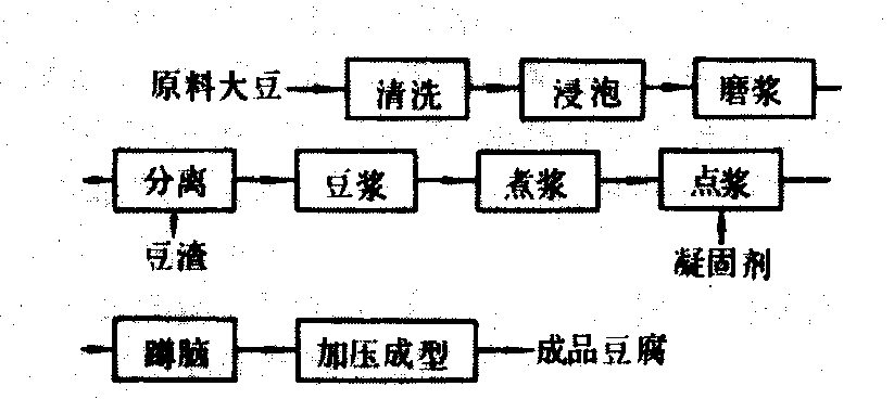 | 释义 | 豆腐加工soybean curd processing以大豆与水为原料经磨浆、加热、点浆、蹲脑、压型等工序,制成鲜嫩豆腐的生产过程。豆腐是利用大豆蛋白质能溶于水的特性以及经过热变性的蛋白质可以用凝固剂改变成胶体性质而制作的。其加工工艺流程见图1。