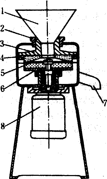 图2 砂轮磨浆机 1.料斗;2.调节手轮;3.上固定盘;4.上砂轮磨片;5.下砂轮磨片;6.下固定盘;7.出料口;8.电机 浸泡 使大豆组织膨胀松软,易于磨制和抽提蛋白质。影响浸泡的因素有原料的品质,浸泡温度及时间等。浸泡时的加水量应以水浸没全部大豆为准。浸泡好的大豆增重1.8~2.5倍,豆瓣的内表面略有凹坑,手指捏之易断,断面无硬心。 磨浆 将浸泡好的大豆磨碎, 使大豆中的蛋白质溶解出来, 形成较稠的豆糊。豆糊的粗细直接影响出品率。磨浆的设备有石磨, 钢磨以及砂轮磨。砂轮磨(图2)由上、下砂轮磨片构成, 砂轮磨片用黑色碳化硅及陶瓷粘结剂烧结而成, 体积小, 效率高, 磨浆时产生热量小。磨浆时的加水量为原料大豆的6~7倍。 分离 又称滤浆,是从豆糊中提取豆浆,除去豆渣的过程。分离的好坏,直接影响豆浆及豆腐的质量。为了尽量回收渣中残留的蛋白质,需要对头遍渣进行清水或淡浆洗涤后再二次分离,二遍渣用水洗涤后再三次分离。分离的方法很多,有人工晃包,振动筛,挤浆机以及离心机等。一般使用浆渣自动分离的砂轮磨连续完成磨浆、分离工作。组合式滤浆机(图3)是一种较好的分离设备,沫糊先经滤浆圆筛滤出头浆,再由加压橡胶辊及大滤浆筒挤出含微细豆渣多而浓度低的豆浆,大滤浆筒表面的豆渣被刮入豆渣接收槽,豆浆由接浆槽经输浆管泵送到滤浆圆筛再过滤,以降低豆渣中的蛋白质残留量。