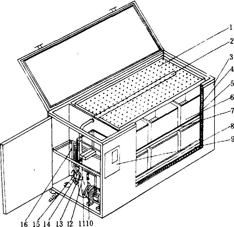 ZDJ-2型卧式半自动豆芽菜生长机示意图 1.淋水盆;2.喷水器; 3.外箱体;4.内箱体;5.保温层; 6.培养箱;7.中支架; 8.下支架;9.控制器;10.水位标; 11.循环泵;12.温度传感器;13.加热器;14. 出水管;15.喷 水管; 16. 进水管