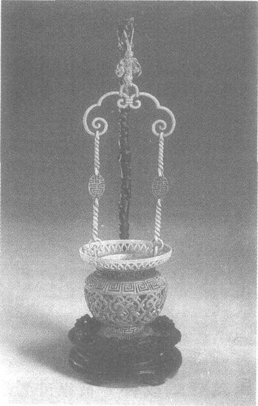 | 释义 | 象牙染色镂雕花篮 象牙染色镂雕花篮清雍正至乾隆(公元1723—1795年)。通提梁高17厘米,口径6.2厘米,足径3.9厘米。北京故宫博物院藏。花篮形如侈口尊:盘口,直颈,斜肩,鼓腹,高圈足。篮边雕双绳纹活动提梁,绳纹间刻“寿”字;篮体透雕各种纹饰:有瓜棱纹、拐子纹、卷云纹、回纹等,并染色。篮内还有镂雕的钱纹花囊。花篮造型美观,雕刻精细,染色华贵。造办处见“象牙雕万年青纹香囊”条目。