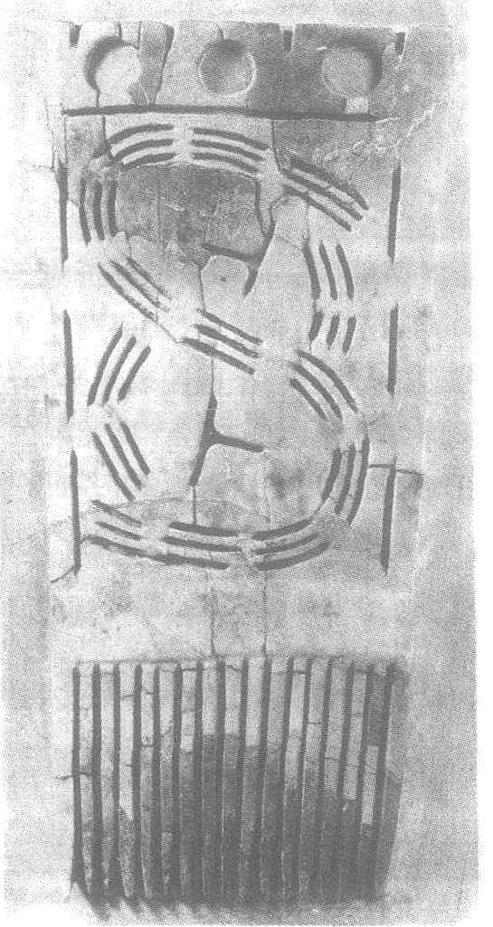 | 释义 | 象牙雕回旋纹梳 象牙雕回旋纹梳新石器时代。长16.4厘米,宽8厘米。1959年山东省泰安市大汶口出土。北京中国历史博物馆藏。象牙皮制成,稍稍有点弯曲。梳的平面上宽下窄,呈梯形。17枚梳齿细密均匀。背部的纹饰分两组:上边缘为3个透雕的圆孔,一字形排开。其下的“冂”形框内,三条平行线断续如八卦中的泰卦,延伸回旋呈“8”形,并在上、下两个圆圈内各饰一个“T”纹,一个向左、一个向右。框与“8”形纹饰亦为透雕。此梳是我国目前发现最早的透雕象牙制品,距今已有六千多年的历史。制作精致,透雕技术高超,是新石器时代牙雕器的佳作。
