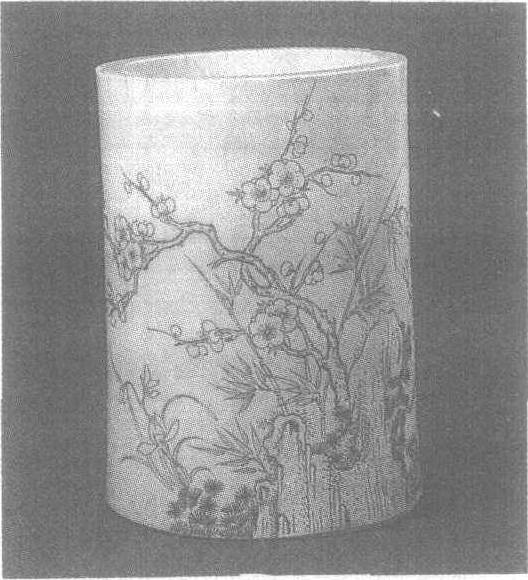 | 释义 | 象牙雕梅竹兰松石图笔筒 象牙雕梅竹兰松石图笔筒明。约为嘉靖至崇祯(公元1522—1644年)。高12.7厘米,径9厘米。北京故宫博物院藏。呈圆柱形,其上阴刻梅竹兰松石图,并用行楷刻一首七言绝句:“问余何事栖碧山,笑而不答心自闲。桃花流水杳然去,别有天地非人间。”梅竹松称为“岁寒三友”,加以石兰又称作“五清图”,均象征高洁、正直、坚强及不畏强暴。此笔筒诗情画意兼备,刻镂圆熟典雅,是一件优秀的作品。