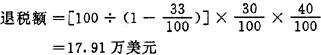 例:某外国投资者在减免税期满后某一年,将从企业取得的利润中的一部分计100万美元,再投资于该企业增加注册资本,即可取得退税额17.91万美元,计算方法如下:
