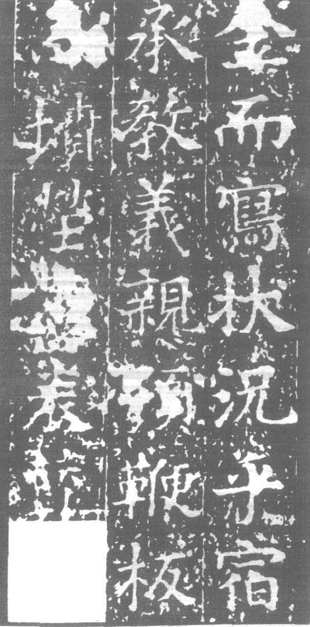 賀若誼碑(局部) 又名〈海陵郡公賀若 誼碑〉。隋·開皇十六年( 596 )刻。碑高一丈一尺,廣三尺八寸五分。楷書二十八行,行六十七字。額篆書陽文二十字。筆極精整,書勢遒勁,亦隋碑中能 品。《香南精舍金石契》曰:“書法宏整,似勝〈龍藏〉,然秀潤遜之。趙子函謂為唐初諸人之前芽,良是。”清楊守敬《平碑記》稱其“書法方整秀勁,初唐人多似此體,王行滿〈韓仲良碑〉即從此出,昭陵諸碑尤多似者”。對初唐書壇影響甚鉅。此碑上半頗清朗,但下半極漫漶,故每不拓下截。據《雍州金石記》,宋人謂碑陰刻〈夫子廟堂碑〉,而清畢沅《關中金石記》謂有〈大觀聖作之碑〉,兩說不一。立于陕西興平縣文廟。 |