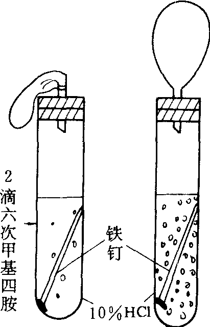 向两个小试管中各倒入半试管浓度约为10%的稀盐酸,再分别投入两枚新铁钉,不久就看到两支试管中气泡翻滚,铁和盐酸反应,放出大量氢气。此时向其中一支试管中滴入2~3滴20%的六次甲基四胺 (优洛托品) 的水溶液,就能看到,这个试管气泡明显减少。这时再同时在两个试管口各套上一个捏瘪的小气球 (见下图)。