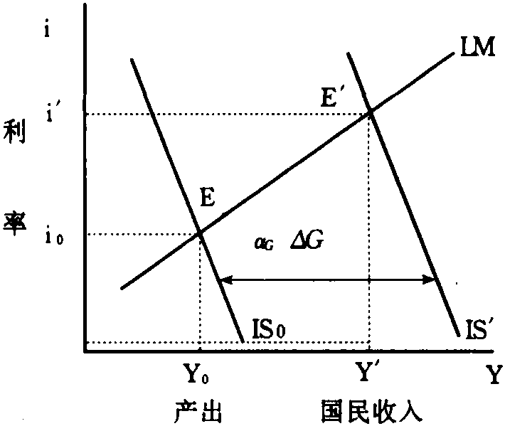 其中Y表示产出水平,i表示利率,这两个变量是该模型的内生变量。A表示自主支出,由自主投资、政府支出和自主消费等等组成。c表示收入的边际消费倾向,t表示税率,b反映投资对利率的敏感程度,  表示货币供给。k反映货币需求与收入水平的关系,h反映货币需求对利率的敏感程度。 我们以增加政府购买为例分析财政政策效果。设政府购买增加△G,则△A=△G,下图形象地反映了政府购买增加后对产出水平的影响过程: 一般假设,对于各种扰动货币市场能够迅速出清并持续处于均衡状态,而产出调整却要慢得多,考虑货币市场的现实并与商品市场的调整速度作一比较,这一假设并不远离实际。根据这个假设,调整过程基本上是沿着LM曲线进行的。这样假设的优点在于使分析简单明了又不过分脱离实际。增加政府购买意味着在每个利率水平上扩张了总支出,因此使IS曲线右移到IS′。在原先的均衡水平上存在着对商品的过度需求,这将使公司增加产出从而使收入增加,收入增加会增加货币需求,在货币供给不变的情况下,会导致利率上升,因此增加政府购买会增加产出并提高利率水平。经济最终在E′点达到新的均衡,与原先的均衡水平相比,产出增加了,利率提高了。利用上面的数学模型,可以计算出产出和利率的增加值。