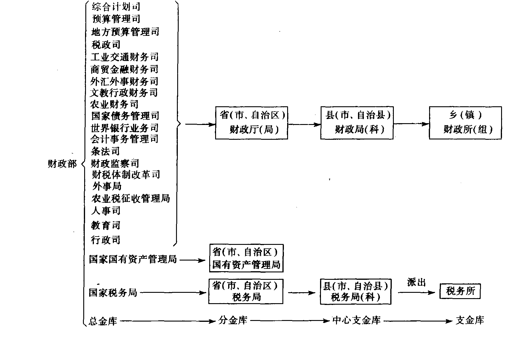 亦称“财政机关”。国家行政机关中负责财政管理工作的机构。包括国务院设立的中华人民共和国财政部,各省、自治区财政厅,直辖市财政局,各行政公署财政处,各县、市、自治州、自治县、市辖区财政局,以及各乡、镇财政所,形成了一个完整的体系。地方各级财政部门受各级政府及其派出机关领导,同时在财政业务上受上一级财政部门领导。我国从中央到地方的财政部门相互关系可用下图表示:
