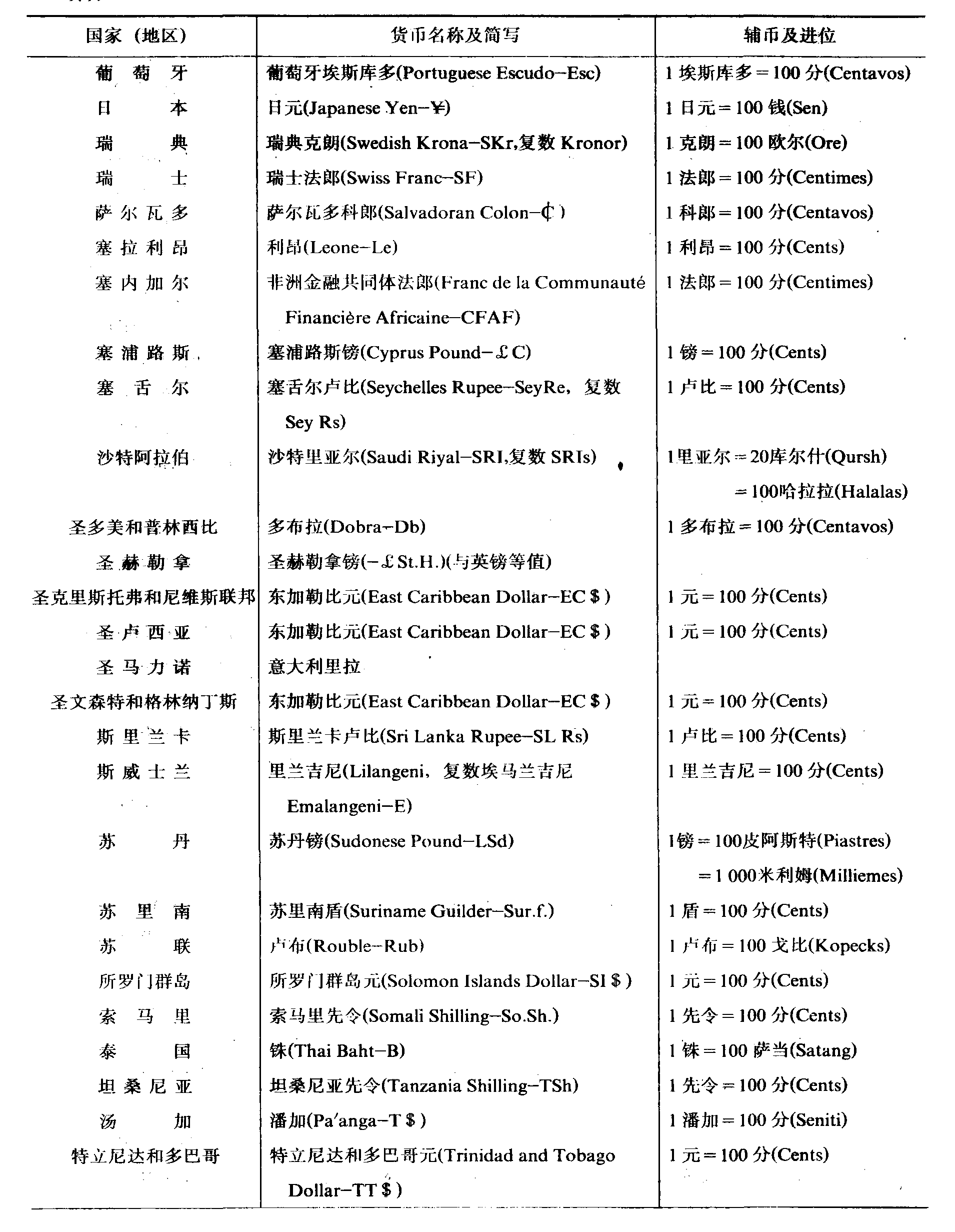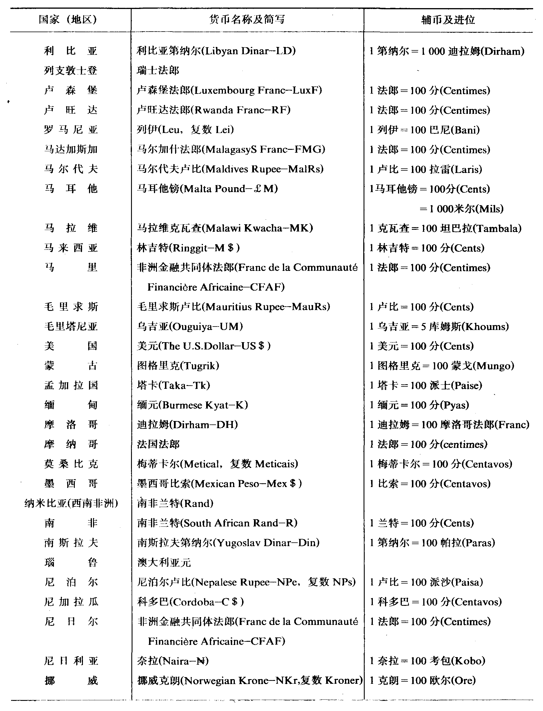 世界各国 (地区) 本位货币名称一览表