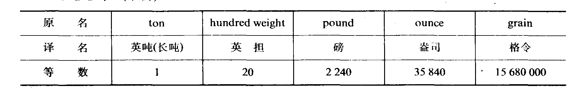 注: 1英加仑=277.274立方英寸 1美加仑=231立方英寸 三、 重量表 (常衡)