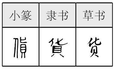 【释义】《说文》:“货,财也。”本义是财物,金钱珠玉布帛的总称。引申指流通的货物、商品,又表示充当一般等价交换物的特殊商品货币。