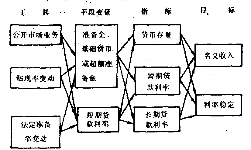 图1—14 在许多货币银行学教科书中,对货币政策工具与货币政策手段一般不做区别。但在近年来出版的一些货币经济学教科书中,则对工具和手段从作用上作了明确的区分。区分的理由是:工具的作用主要是改变了银行的准备金和短期贷款利率,与高就业和价格稳定等目标还有一段距离。银行准备金和短期贷款利率的变化影响名义收入进而影响就业和价格水准还需要一段时间。为此,在货币当局在其政策工具和最终目标之间,插进了两组中间变量。第一组称中介指标,由直接影响总需求进而影响名义收入的各个变量组成,如货币存量和长期贷款利率。但是货币当局也不能直接通过货币政策工具来实现这些目标。这样,又产生了一组可称为手段的次一级目标,或者说是介于工具和中介指标之间的近似指标。这些变量也是货币当局可以直接干预的。这样,货币当局的政策工具和目标之间的关系就如图1—14所示。 ☚ 股权收益率指标 货币调节传导机制 ☛ |