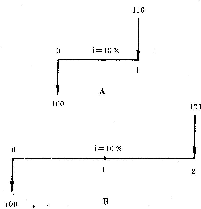 现金流图 货币资金的运动包括不同时刻的资金流出和流入。为了明确地表明不同时刻货币资金的流出和流入情况,可以采用图解法把不同时刻的现金流以简单而清晰的方式表示出来,这就是所谓的“现金流图示法”。这种方法是把货币资金作为时间的函数,用图形表示出来。横轴的右方代表时间的延伸,横轴上的坐标表示每一时间区间的终点,横轴的零点代表现在的时刻,以横轴上引出的带箭头的垂直线段,代表货币资金值。在时间零点的资金值,就是资金的现值,而在时间轴上不同点的垂直线段就是那个时刻的资金值,即终值。垂直线段指向时间轴表示资金流入,而背向时间轴则表示资金流出。例如,从贷款人方面看,为在一年后收回110元而目前贷出100元,其差额10元就是本年的利息,为在两年后收回121元而目前贷出100元,其差额21元就是这两年的利息,用年利率表示都为10%,现金流图示如图2-3: