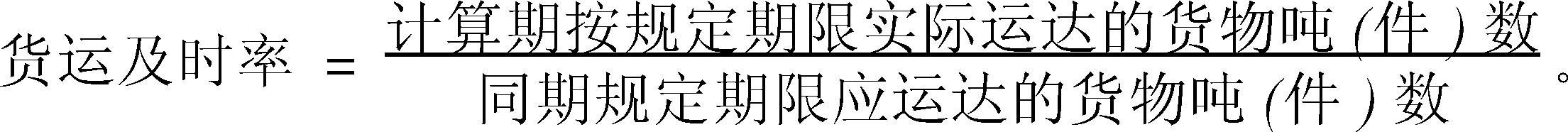 | 释义 | 货运及时率 货运及时率rate of freight in time一定时期内承运人按货运合同规定期限,实际运达的货物吨(件)数与应运达的货物吨(件)数之比。用“%”表示。计算公式为: