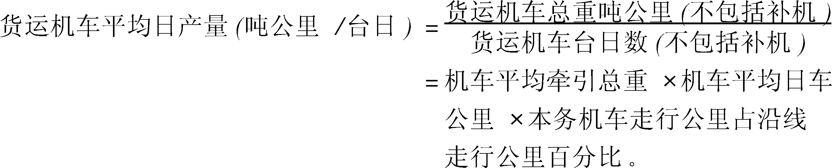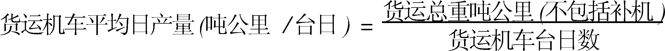 | 释义 | 货运机车平均日产量 货运机车平均日产量freight locomotive gross ton-kilometers per locomotive day简称“机车日产量”,又称“货运机车生产率”。平均每台货运机车在一昼夜内完成的总重吨公里数。从货运机车在时间和牵引能力的利用两个方面,综合反映货运机车运用效率的指标。其计算公式为: