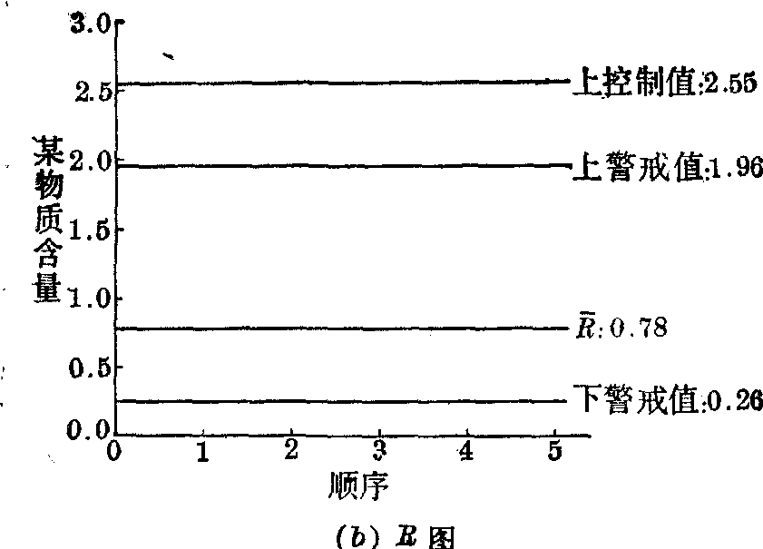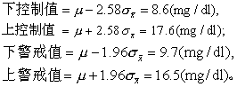 图2 均数控制图(a)和极差控制图(b) 正常值平均法均数控制图(Hoffman和Waid,1965)绘制原理是根据样本均数的分布服从于均数为μ,标准差为σ/n1/2的正态分布,实际工作中总体均数μ及总体标准差σ常以样本含量足够大的样本均数及标准差来估计。本图可用以判定实验的准确度。绘制时先要知道正常值范围,筛去正常值范围以外的数值,以正常值范围内的测定结果为计算依据。适用于医院病人临床检验质量的考核。利用逐日检验登记进行计算绘图。必要时也可按年龄、性别、诊断、治疗或其他有关因素分组绘制控制图。当仅有一个偶然的点子落在警戒值外,可以认为方法是稳定的,但有两个连续点子落在外面,则提示异常。 例3 某医院1979年6月5日至6月9日住院病人全血尿素氮测定结果,在正常值范围3~20mg/dl者共118例,均数X为13.1mg/dl,标准差s为3.90mg/dl,试据此绘制正常值平均法均数控制图(取每批例 数n=5); 6月10日至11日继续测定尿素氮值在3~20mg/dl范围内的患者12批,每批5例,均数X如下,就此用控制图作出评价。