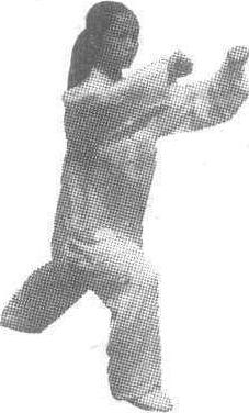 太极拳拳法。杨武、吴式: 两拳自下经两侧,臂内旋向前圈贯,与耳同高,拳眼斜朝下,两臂呈弧形。单拳同此要求,拳略高于头。如图。