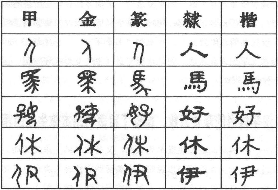 图6—3 牛的变形过程 (毕加索作) 在1945年12月5日的图中,牛是十分逼真的、活灵活现的、惟妙惟肖的客观物体的再现。在1946年1有2日的第八稿中,牛已经被分解为块状的结构。而在1946年1月17日的第十一稿中,牛已经完全成为线条,与象形文字没有多少区别了。从这幅作品中我们可以看到毕加索对具体事物进行抽象概括的过程。这种抽象和概括,正是文字构形中人类快感到美感的一种升华。 摹仿事物形体,是各民族早期文字的共同特点,如苏美尔文字、埃及古文字、玛雅文字等,无不如此。这些文字都体现出了毕加索 《牛的变形过程》的这种抽象概括的过程。汉文字,也经历了这种由图画到线条的抽象和概括。 下表中,甲骨文和金文最为象形,从小篆开始,文字逐步线条化、抽象化、符号化。由这些字符演变的过程,可以看出汉字符号本身就有着高度的抽象化、概括化、形式化和规范化的特点,是汉民族逻辑思维的结晶,它的造型构思离不开想象、联想和推理。“由于汉字以象形为基础,在象物、象事、象意、标示的构型中具有象征性,这种象征性一经人为约定,就使它具有逻辑思维的功能。既能直接间接地激发听、视、想象去推断字义、也能从符号的构型中去反推先民造字时的逻辑思维的认识成果。”[10]