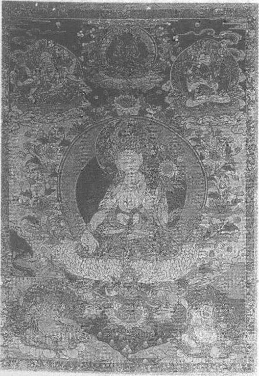 清。纵120厘米,横82厘米。西藏自治区拉萨市布达拉宫藏。“度母”亦称“救度母”、“多罗母”等。藏传佛教女神名,传说为观音化身的救苦救难本尊,以颜色区分,现有21相,以白度母、绿度母最为常见。此幅中间人间界以淡蓝为地,中央白度母跏趺坐,姿态婀娜,头戴宝冠,广鼻阔耳,微张的双眼显露出超脱、飘逸的神态,浅色的肌肤以淡淡的晕色来烘托,上眼睑和直鼻梁上提以浅粉,使其形象轮廊更加鲜明丰满。四周有佛光及鲜花环绕。上方天界以深蓝色为地,有三个姿态雍容华贵的三大天神。下方地界以浅绿色为地,有二个怒目的地神。此贴花是用各色绫子及织金缎,幅外用织金缎及织金妆花缎装裱,气派庄严,豪华富丽。