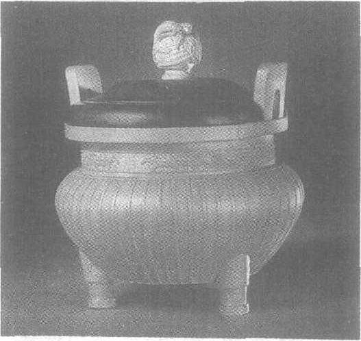 清。高21.1厘米。北京故宫博物院藏。仿青铜器。圆形。有盖、双立耳、盘口、直颈、三足。紫檀盖上饰一竹根雕的伏鸟钮。炉颈部一圈回纹贴黄地上,嵌贴夔龙和兽面纹。腹部在贴黄地上,直贴瓜棱条纹。工艺虽复杂,但处理得干净利落,简洁明了,表现出作者的高超技艺。贴黄见“贴黄蕉叶纹长方盒”条目。