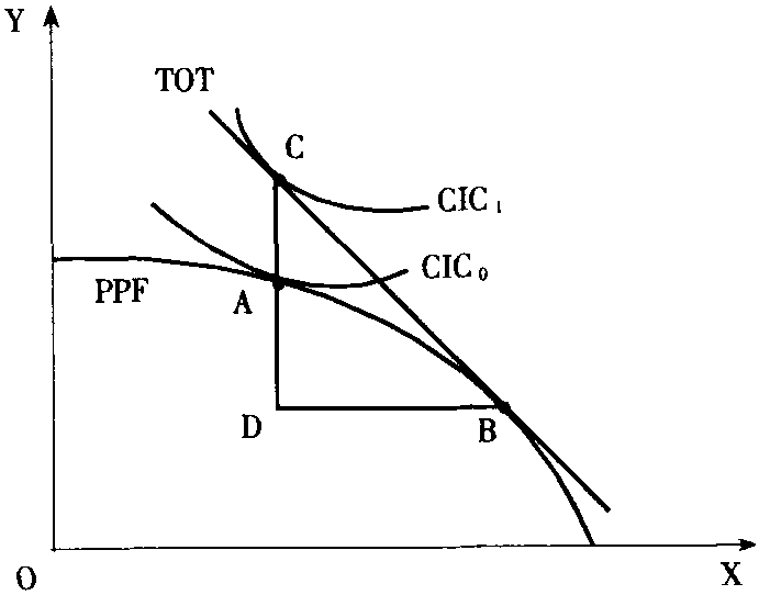 0代表。开放贸易后,该国按贸易条件(TOT)进行消费和贸易交换。TOT与PPF的切点即为贸易后的生产点B,而贸易后的消费点位于TOT线与所能切到的最高一条CIC曲线的切点即C点,此时的社会福利水平为CIC