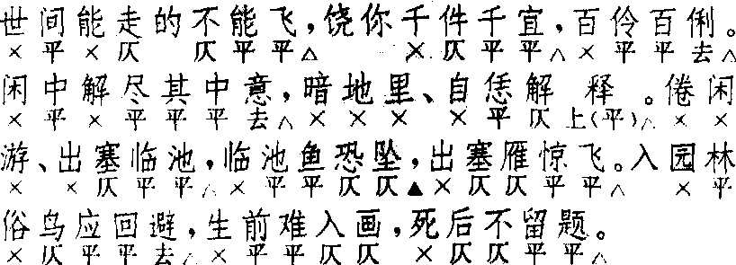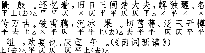 此词抒激壮之情宜用入声,抒凄郁之情宜用去声。 ☚ 摸鱼儿 兰陵王 ☛ 贺新郎 贺新郎钟嗣成 《自序丑斋》套 ![]() 全曲十一句:7△,4△,4△。7△,7△。7△,5▲,5△。7△,5,5△。第二、三句须对。第七、八句及第十、十 一句,作者多用对语。第六句属上属下均可。第七句可收平声,如关汉卿《谢天香》“除籍不为娼”,《玉镜台》“取水垂辘轳”。末二句可作七字句,如关汉卿《拜月亭》、《谢天香》。减第五句者,有孛罗御史“懒簪獬豸冠”套、郑廷玉《金凤钗》、罗贯中《风云会》三例。宋词及诸宫调均有〔贺新郎〕,诸宫调比词牌多了一些变化。南〔南吕〕慢词(引子)同词牌,过曲有所变化。北曲词式相对要丰富得多:首句七字,接着两个四字句,与诸宫调相当;中间三个七字句,句数相同;后部北曲两联五字句,诸宫调只作两个六字折腰句,南过曲亦只作两联三字句,北曲是大大发展了。 ☚ 菩萨梁州 斗虾蟆 ☛ 贺新郎 贺新郎无名氏 《分镜记》 ![]() 全曲十句:4,7△。7△。3,7△,7△。3,3△。8△,6△。第九句可作上三下五、上五下三或上一下七式八字句;亦可作普通七字句,即减去八字句的句首一字。联套时与〔节节高〕联成短套,如《东郭记·一妾》用〔贺新郎〕三支、〔节节高〕二支,《邯郸记·入梦》用〔贺新郎〕二支、〔节节高〕二支,《赠书记·花烛猜谜》用〔贺新郎〕二支、〔节节高〕一支。〔贺新郎〕套数不多见,作者多用〔梁州新郎〕套。与词牌不同。《杀狗记·乔人算帐》、《双珠记·军门优恤》、《鸣凤记·邹慰夏孤》所用〔贺新郎〕,均为词牌。南北曲均有〔贺新郎〕,皆出于词牌,各有变化增减。以〔贺新郎〕为主的集曲有〔新郎抚孤雁〕,见《南词简谱》。 ☚ 梁州新郎 节节高 ☛ 贺新郎 贺新郎又名《乳燕飞》、《贺新凉》、《风敲竹》、《金缕歌》、《金缕曲》、《金缕词》、《貂裘换酒》、《金缕衣》,《风瀑竹》,清人又有名《雪月江山夜》者。见宋苏轼《东坡乐府》。杨湜《古今词话》云:“苏子瞻守钱塘,有官妓秀兰天性黠慧,善于应对。湖中有宴会,群妓毕至,惟秀兰不来。遣人督之,须臾方至。子瞻问其故,具以发结沐浴,不觉困睡,忽有人叩门声,急起而问之,乃乐营将催督之。非敢怠忽,谨以实告。子瞻亦恕之。坐中倅车属意于兰,见其晚来,恚恨未已。责之曰,必有他事,以此晚至。秀兰力辩,不能止倅之怒。是时榴花盛开,秀兰以一枝藉手告倅,其怒愈甚。秀兰收泪无言,子瞻作《贺新凉》以解之,其怒始息。”胡仔《苕溪渔隐丛话》驳之甚详,并谓:“此词腔调寄《贺新郎》,乃古曲名也。今乃云取其沐浴新凉,曲名《贺新凉》,后人不知之,误为《贺新郎》。”然云《贺新郎》为古曲名,则不知何据。《词律》卷二○列毛开及高观国所作。《词谱》卷三六因苏轼词下片“花前对酒”句少一字,且格调未谐,故以叶梦得所作(睡起流莺语)为正体,双调,一百十六字,上、下片各十句六仄韵。《词谱》收别体十种。 ☚ 贺明朝 贺新凉 ☛ 贺新郎鹤发开元叟。也来看、荆高市上,卖浆屠狗。万里风霜吹短褐,游戏侯门趋走。卿与我、周旋良久。绿鬓旧颜今改尽,叹婆娑、人似桓公柳。空击碎,唾壶口。 江东折戟沉沙后。过青溪、笛床烟月,泪珠盈斗。老矣耐烦如许事,且坐旗亭呼酒。判残腊、消磨红友。花压城南韦杜曲,问球场、马弰还能否? 斜日外,一回首。 康熙六年(1667)秋,作者守制期满,由扬州回到北京,在扇头看到曹实庵《贺新郎》“咄汝青衫叟”赠柳敬亭词。抚今思昔,感念柳生虽穷途寥落,憔悴京门,而意气犹存,滑稽仍旧,其为人有足多者,因援笔次韵,作成此词,盖亦赠柳之作也。曹实庵,即曹贞吉,字升六,号实庵,山东安丘人,行辈略后于作者,时为中书舍人。工诗词,词风雄浑苍莽而语多奇气。柳敬亭,明末泰州人,本姓曹,避仇流落江湖,尝休息于柳树下,乃改姓柳。善说书,曾客于明宁南侯左良玉幕下,受到宁南的礼遇,军中呼为柳将军而不名。左 良玉殁后,所部数十万众在九江溃散,不久清兵渡江陷南京,柳敬亭浪迹各地,重操旧业。他眷怀故国,富有爱国思想,借说书抒发胸中愤慨悲凉情绪。吴伟业、黄宗羲皆作有《柳敬亭传》。 上片起三句,感慨悲歌,点明人物正在燕京。首句“鹤发开元叟”,“鹤发”,白发,“开元叟”,表明其为前朝旧人。这句以唐代著名乐师李龟年比柳敬亭。李龟年在开元中供职梨园,经过安史之乱,流落江南,不知所终。柳敬亭的身世和李龟年有相似之处。他们都是一代著名艺人,都富于爱国思想,都曾经遭逢丧乱,以后都沦落江湖,度过白发的晚年。词称柳敬亭为 “鹤发开元叟”,真是恰当不过。二、三两句“也来看、荆高市上,卖浆屠狗” ,“荆高”,指战国末期燕国的荆轲、高渐离。荆高市,即燕市,指燕京。荆轲为燕报秦仇,临行曾悲歌于易水之上,高渐离击筑和之,为变徵之声,士皆泣涕。事见《史记·刺客列传》。“卖浆屠狗”,“卖浆”,卖酒者; “屠狗”,卖狗肉者。《史记·魏公子列传》载:“赵有处士毛公藏于博徒,薛公藏于卖浆者家。”同传: 朱亥 “在市屠中”。(《史记·樊哙列传》载: 樊哙未遇时,以屠狗为业。)此其人皆身处下层,隐于市井,而负有节概,为豪侠之士。词以 “也来看”三字表明柳敬亭此来京都,是为了看望像荆、高、毛、薛、朱亥那样的怀抱奇志的义烈之士,可见柳敬亭不与寻常艺人相同。接着以