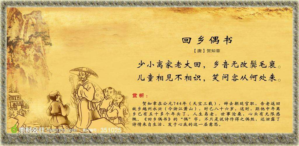 | 字词 | 贺知章《回乡偶书》,少小离乡老大回,乡音难改鬓毛衰。 儿童相见不相识,笑问客从何处来。 |