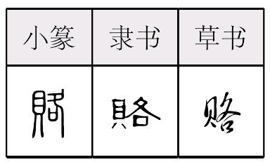 【提示】 , 3画, 不要错写成4画的攵。 *赂(賂)lù10画 贝部 (1) 〈书〉 财物: 货~。 (2) 用财物买通别人: 贿~。 赂賂lù古代形声字。从贝(貝,商代和西周以贝为货币),各声。声母演变如各路洛骆、果裸例,韵变如各路、者诸堵例。本赠送财物义。引申指贿赂,用财物买通别人。转为名词,指财物。 赂賂★繁◎常★常