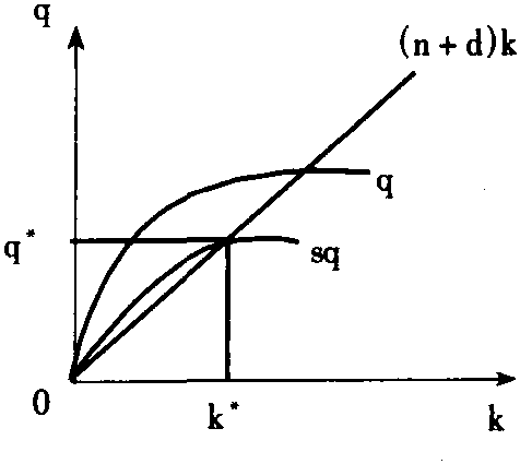 资本扩大zī běn kuò dàувеличéние капит ла资本扩大Capital widening以与劳动力增长相同的速度积累资本的过程。其基本内容是,由于工人数量的上升,为保持人均资本存量不变而进行的投资。如果一国的储蓄量大于资本扩大的要求,则会带来人均资本存量和人均产出的增长,从而产生资本深化过程。如果储蓄量恰好满足资本扩大的需要,经济中的人均资本存量和人均产出均保持不变,称经济处于稳定状态。在基本的索洛(Solow)模型中,假设Q为经济总量,K为总资本存量,L为劳动力,q为人均产量,k为人均资本存量,劳动力增长率为n,资本的折旧率为d,则Δk=sq-(n+d)k,此时劳动力增长率n决定了储蓄中用于资本扩大的份额,因为劳动力人数的增长需要使用一定数量的储蓄以保持其他工人已经拥有的人均资本存量不变,资本扩大的数量等于nk,用图形表示:图中sq曲线代表经济中的储蓄量,(n+d)k被资本扩大线,二者之间的缺口会导致经济的动态调整,直至二者相等。如果人口增长率下降了,则资本扩大线变得更加平坦。初始点上的资本扩大要求下降,经济中出现了多余的储蓄,开始了一个资本深化过程,人均资本存量上升,直至在新的较低的人口增长率下重新达到均衡状态。