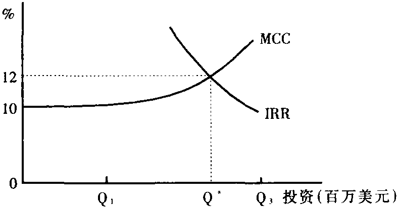 图1 具体的投资方案 资本预算工作对企业未来的发展关系重大,因而要涉及到计划、生产、销售、会计、技术和采购等许多部门的活动。由于投资方案中的收益流量和资金成本的计算中都带有不确定性,因而投资决策是一个十分复杂的过程。但从经济上讲,所遵循的原则仍为边际原则(边际收益等于边际成本),不过这里的边际收益为投资收益率,边际成本为企业的资金资本。可用图说明这个原则。图1中横轴为全年投资额,纵轴既表示资金成本的百分数,又表示投资方案的收益率。图1中的长方形为投资方案,例如方案A的支出为300万美元,预期收益率为17%;方案B的支出为100万美元,预期收益率为16%;等等。最后的投资方案G是购买利息率为4%的国库券,购买量不受限制。图2把图1信息概括为一条平滑的投资机会曲线,标为IRR,即内部收益率。MCC曲线为资金的边际成本,即每多筹集1美元投资所需支出的成本,如图1所示,在企业投资增量1 300万美元以前,边际资金成本保持在10%以上,超过1 300万美元,资金成本开始上升。企业为了获得最大利润,应采用投资方案A、B、C和D,放弃投资方案E、F、G,即共投资1 100万美元。图2表明企业的投资额为Q*美元,在这里资金的边际成本为12%,与最后采用方案的投资收益率相同。 ![]() 图2 平滑的投资机会曲线 资本预算工作是一个十分复杂的过程,实际上几乎要用到管理经济学的全部理论和方法。其主要步骤为: ❶估计未来的需求; ❷确定经营的成本函数; ❸预测现金流量; ❹确定资金成本(包括债务成本和股本成本); ❺事后审计。 ☚ 逆向选择 β系数 ☛ |