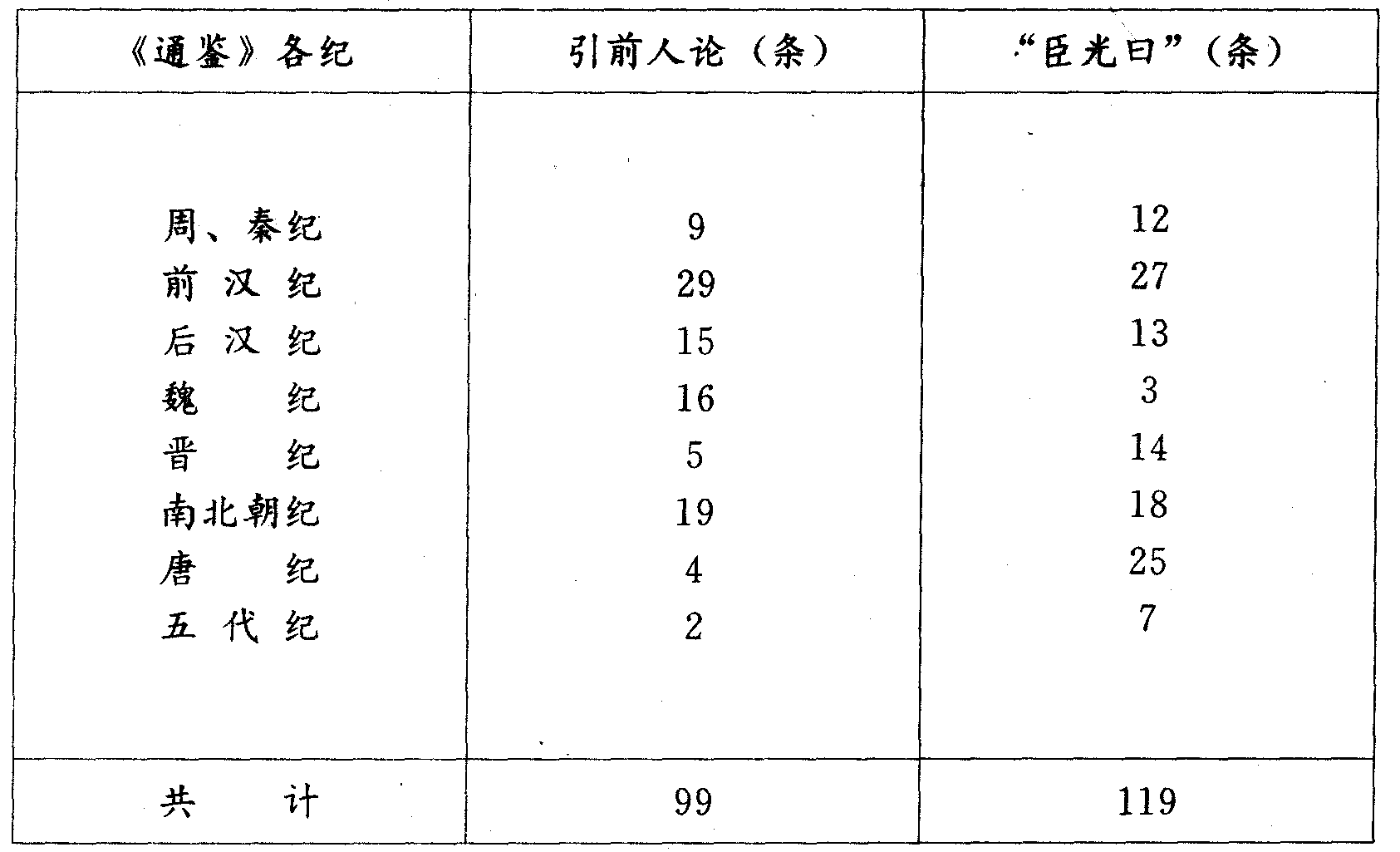 司马光主编 《通鉴》, 在编写史事上, 充分调动二刘一范的积极性, 既分工又合作, 最后统一定稿, 在历史评论上, 则一律由他个人负责, 统一发论。 《通鉴》 全书中, 共有二百十八条史论, 其中一百十九条是 “臣光曰”, 还引了前人史论九十九条, 而没有一条臣恕曰、 臣攽曰、 臣祖禹曰。 《通鉴问疑》所言 “其是非予夺之际, 一出君实笔削”, 若是指《通鉴》史论而言, 那是完全对的。 我国古代史学讲究经世,论史往往寓论政。 司马光的史论尤其如此,可谓一大特点。 司马光的史论与政论相通。 先说他论礼。 《通鉴》 第一条是礼论 (即名分论), 开头说: “臣闻天子之职莫大于礼, 礼莫大于分, 分莫大于名。何谓礼?纪纲是也。何谓分? 君、 臣是也。何谓名?公、 侯、 卿、 大夫是也。”又说: “夫礼,辨贵贱,序亲疏, 裁群物, 制庶事, 非名不著, 非器不形;名以命之,器以别之,然后粲然有伦, 此礼之大经也。 名器既亡, 则礼安得独在哉!” 照他说, 君君臣臣, 尊卑有分, 贵以临贱, 上之使下的观念与秩序,就是礼, 就是名分。维持此礼, 天下大治; 废弃此礼, 天下大乱。 古来历史就是如此。 这是他编写 《通鉴》开宗明义的大议论。像这种史论, 在他的政论中屡有出现。如庆历五年所作《不以卑临尊议》(见《司马文正公传家集》卷六六)言君臣父子之间,尊卑有别,不能 “以卑临尊”, 这是 “人道之大伦, 古今之通义”。 如嘉佑七年所作《上谨习疏》(见《传家集》卷二四), 言“国家之治乱本于礼”,古代有礼所以往昔治,三家分晋失礼所以后来乱, 当今之政有失 “上下之分”, 宜立纪纲。 又如治平元年所作 《言阶级札子》 (见 《传家集》卷三三), 言 “礼者, 上下之分是也”, 只有严遵“阶级之制”, 才可能“纪纲复振, 基绪永安”。 还有“礼不忘其本, 此古今不易之常道也” ( 《传家集》卷三五 《为宰相韩琦等议濮安懿皇合行典礼状》),“国无二君, 家无二尊” ( 《司马温公文集》卷六 《言濮王典礼札子》) 等等政论言词。 足见史论与政论之声气相通。 再说他论 “本末”。 《通鉴》卷五七有条本末论, 其论曰: “明王之政, 谨择忠贤而任之, 凡中外之臣, 有功则赏, 有罪则诛, 无所阿私, 法制不烦而天下大治。 所以然者何哉? 执其本故也。 及其衰也, 百官之任不能择人, 而禁令益多,防闲益密,有功者以阂文不赏, 为奸者以巧法免诛,上下劳扰而天下大乱。所以然者何哉?逐其末故也。 孝灵之时, 刺史、 二千石贪如豺虎, 暴殄烝民, 而朝廷方守三互之禁, 以今视之, 岂不足以为笑而深可为戒哉!”这是说任贤为 “本”,法苛为 “末”, 用法不如任贤, 其中 “以今视之”及 “深可为戒”之语,实将史论与政论联系起来了。这种本末论,在司马光的政论中时有出现。如,嘉佑七年,他针对当时特置官使, 多 “变更旧制”、 “张设科条”, 而言 “今朝廷不循其本而救其末”, 并论道: “夫宽恤民力, 在于择人, 不在立法, 若守令得人, 则民力虽欲毋宽, 其可得乎?守令非其人, 而徒立苛法, 适所以扰民耳!”(《传家集》卷二五 《论财利疏》) 这是说, 择人为本, 立法为末。 所论与 《通鉴》 的本末论口径相同。 在熙宁二、 三年间, 司马光大反王安石变法, 其立论理由, 王安石 “变更祖宗旧法”, 信用 “邪说壬人” ( 《传家集》卷六十 《与王介甫书》及 《第二书》、 《第三书》); “增官则以冗增冗, 立法则以苛增苛”(《司马温公文集》卷七《乞罢条例司常平使疏》); “法亦不法, 所遣亦非其人” (朱熹 《三朝名臣言行录》卷七 《司马光》)。 还是择人为本、 立法为末的论点。 司马光的史论, 不仅寓政论, 而且往往影射现实, 反对王安石及其变法。他强调择人为本, 立法为末, 实有影射王安石信用吕惠卿和变更法制之嫌,只是还不十分明显。 大约熙宁七、 八年间, 司马光在 《通鉴》 中写了这么两条 “臣光曰”: 一条论, “ ‘ 《诗》 三百, 一言以蔽之, 曰思无邪。’ 君子之于择术, 可不慎哉!”(《通鉴》卷一一九) 另一条论,“君子之于正道, 不可少顷离也, 不可跬步失也。……是以诡诞之士, 奇邪之术, 君子远之。” (《通鉴》卷一五五) 所谓 “正道”,是指 “圣王之道”, 正统的儒家之道; 所谓 “诡诞之士, 奇邪之术”, 是指脱离“正道” 而不符儒术的人与法; 所谓 “择术”, 是要人们亲儒道而远 “邪术”。 这就是影射现实了。 且先看这样几个事实: (1) 早在熙宁二年, 司马光在 《论风俗札子》 (见《传家集》卷四二) 中说:“近岁公卿大夫好为高奇之论,喜诵老庄之言,此非国家之正术。”清人顾栋高指出: “所谓 ‘高奇之论, 喜诵老庄’ 者, 则荆公(王安石) 其人也。”(顾栋高:《司马温公年谱》)这个看法是对的, 因为王安石于熙宁二年建立制置三司条例司 (主持变法的机构), 司马光于熙宁三年二月二十日所上《乞罢条例司常平使疏》 (见 《文集》卷七) 中就有 “条例司自以为高奇之策”云云。 (2) 熙宁三年春, 司马光 《与王介甫第三书》 (见 《传家集》卷六十) 中提到, “但恐介甫 (王安石) 之座, 日相与变法而讲利者, 邪说壬人为不少矣”。 这是说, 王安石对于 “诡诞之士、 奇邪之术”, 不是疏远而是亲近。 (3)熙宁四年二月, 司马光声明自己与王安石“取舍异道”(见《续资治通鉴长编》卷二二○、 熙宁四年二月辛酉)。 (4) 熙宁七年四