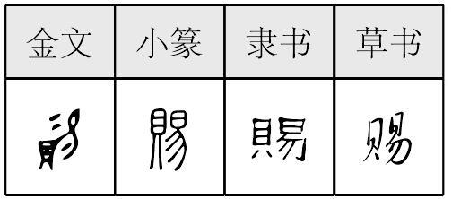 赐*賜cì(12画) *赐(賜)cì12画 贝部 赐賜cì甲骨文和西周金文作“易”。易的字形象从容器口倒出液体(指酒)来。常用于王对大臣,表示“赐给”的意思。古书上常作“锡”。西周末期金文有从目从易的。战国文字小篆隶楷从贝(貝),从易,易亦声。“易”古音声母是舌尖音,如踢字。今仍读tī。“易”与从“易”得声的字读音分化,有脱落声母的,如“易”字;有读舌面音的,如“锡”;有读舌尖前音的,如“赐”。义为赐给,旧时指上级给下级或长辈给小辈。如:恩赐。引申为敬辞。如:赐教|希赐回音。转为名词,指赏给的东西,给予的好处。如:皆受其赐|受赐良多。 赐賜★繁◎常★常