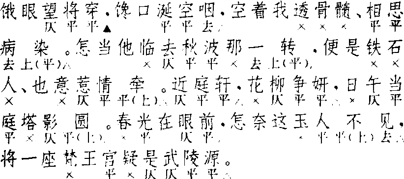 | 释义 | 赚煞 赚煞王实甫 《西厢记》 ![]() 全曲十一句:3▲,3△,7△。7△,7△。3△,4△,7△。4△,4△,7△。第四句偶有不叶韵者,散套如杨果“莺穿细柳”套、王嘉甫“莺花伴侣”套,剧套如狄君厚《介子推》、武汉臣《老生儿》(元刊本)。第六、七句本为两句,《太和正音谱》即如此分,《北词简谱》从之;《广正谱》合为一句,《北曲新谱》从之。问题在第六句三字句能否独立。早期散套,在第七句四字句上用“唱道”二字,如杨果“秋水粼粼”套、彭寿之“平生放荡”套;四字句且不叶韵,如王嘉甫“莺花伴侣”套、石子章“天涯羁旅”套;四字上或用其他衬字,散套如无名氏“杯中酒冷”套,剧套如狄君厚《介子推》;甚至只作四字句,散套如朱庭玉“所欠唯何”套,剧套如尚仲贤《三夺槊》。以上所举各例,均属早期作品,词式尚未定型,这些究属极少数现象,不能据此断定第六、七句必须合为 一句。据《全元戏曲》卷一所收关汉卿十八种杂剧,都用上多少不等的衬字,三字句不衬者有六句,四字句不衬者只三句,未见两句都不衬者,有些衬字较多,两句都较长;最特殊的一例如《裴度还带》(是否关作与本题无关):“琼林宴花压帽檐歪,天香惹宫锦襟怀”,是很难合为一句的。〔赚煞〕又名〔赚煞尾〕、〔赚尾〕、〔赚煞尾声〕、〔煞尾〕、〔尾声〕、〔尾〕。剧套全部用〔赚煞〕为尾声,散套有用其他尾声者。 ☚ 六幺遍 南吕宫 ☛ 赚煞 赚煞曲牌名。又名 〔赚煞尾〕。属北曲仙吕宫。字数定格及韵式,据清·周祥钰《九宫大成谱》正格为三、三、七、七、七、七、七、五、四、七(十句)。今人涂宗涛对《元曲选》中四十首同调作品分析综合后指出该曲调字数定格共十一句,作三、三、六(七)、七、六(七)、三(二)、四、七、四、四、七。这里的第六、第七句之三字与四字,实乃前格第六句之七字的分解。此曲用于套曲,作为套曲的结曲。如《西厢记》第一本第一折张生所唱“饿眼望将穿”一段。 ☚ 离亭宴带歇指煞 煞 ☛ |