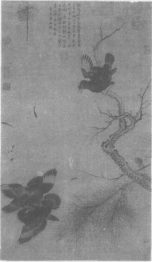 北宋。赵佶。(见《赵佶瑞鹤图卷》条目)绘。纸本墨笔。纵88.1厘米,横51.8厘米。江苏省南京博物院藏。鸲鹆俗名八哥,善斗。图中两只八哥展翅相搏,一反一正,斗得难解难分。上面一只用利爪紧紧抓住对方的胸脯,怒目高鸣,试图凭借暂时的优势地位,迫其屈服。而敌手却不甘示弱,边挣扎,边回过头来猛啄它的右爪。半空中毛羽飞洒,既表现了争斗的激烈程度,又显示出它们一路翻滚的轨迹。另有一只八哥在一旁松树的高枝上对着它们鼓翅呼叫,身体向前斜倾,似乎是在调停、解劝,也可能正在呐喊助威,意欲飞下来参与撕斗。三只八哥的神情刻画得惟妙惟肖。松树只现出一截旁枝,枯瘦、虬劲。尖细的松针攒集在一枝新生出的小杈上,纤长疏朗。此图用笔工细潇洒,墨色浓淡映照,画意奥妙无穷。图上方有赵佶“天下一人”御押,曾入清内府收藏。