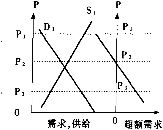 超额需求Excess demand指给定价格下需求减供给之差,用E(P) 表示,则E (P) =D (P) -S(P)。D (P),S (P) 分别表示需求与供给函数。如图在P1价格下,需求水平D1小于S1对应的超额需求为负,在P2价格下供求相等,超额需求为零; 在P3处需求大于供给超额需求为正。供给和需求的关系是:超额需求曲线由左而右向下倾斜,其与纵轴 (价格轴) 的交点为均衡价格,超额需求常用于经济的均衡分析中。