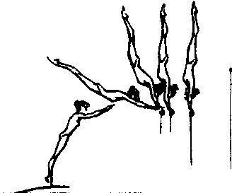 是高低杠的高难度上法。具有独创性加分因素。类似跳马项目的起跳成手倒立支撑的基本动作。该上法动作的过程较简单,但对助跑的水平速度、踏板起跳的力量和撑杠的准确性要求较高,故很少有人能将该上法真正的纳入成套动作之中。动作要领:从面对低杠的低杠外站立开始,经助跑,主动抢脚顶板双臂前摆跳起,向后上方主动直体摆腿形成绕自身横轴的直体向前翻转,当翻转近1/2周时,双手撑低杠顶住双肩,随之含胸吸腹制动下肢的翻转成低杠正撑手倒立。练习者应先经过短距离的助跑做跳马项目的跳起成手倒立的练习,在低杠上搭盖垫子,做助跑跳起成手撑垫子的手倒立的练习。帮助者可站在杠前侧面,一手托其腹部,一手扶其背部,助其后摆向前直体翻转成手撑垫子的倒立状态。该上法亦可在起跳后摆向前直体翻转的过程中,绕身体纵轴转体180°,即“跳起直体后摆转体180°成低杠手倒立”。也是高难度上法,并具有独创性加分因素,类似于跳马项目的起跳转体180°成撑马手倒立的基本动作。该上法应属设想中的动作,虽已编入国际体联制定的女子难度表之中,但尚无人在大赛中使用。