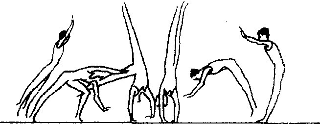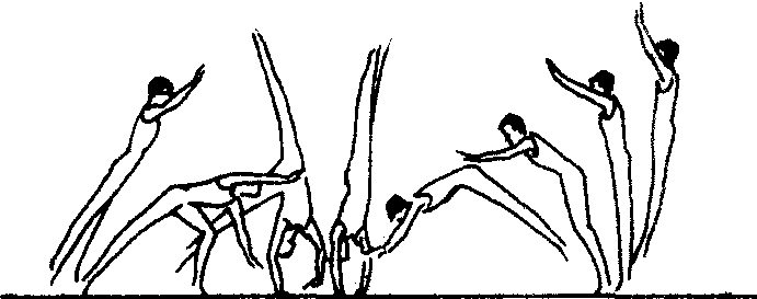小翻踺子 空翻的侧手翻内转90°)。助跑,节奏跳(趋步)后,两手撑地点远于第一种做法。在转体推手后,腿要向远处以前脚掌主动蹬地,迅速伸直膝关节,同时向上领臂、立腰、梗颈向上跳起。空翻踺子教学重点:❶由手倒立开始,两手推地,同时弯曲髋关节,脚向远处蹬踏地,同时向上领臂、跳起,体会推手脚落地跳起的协调用力技术。 ❷在帮助下做完整动作练习。