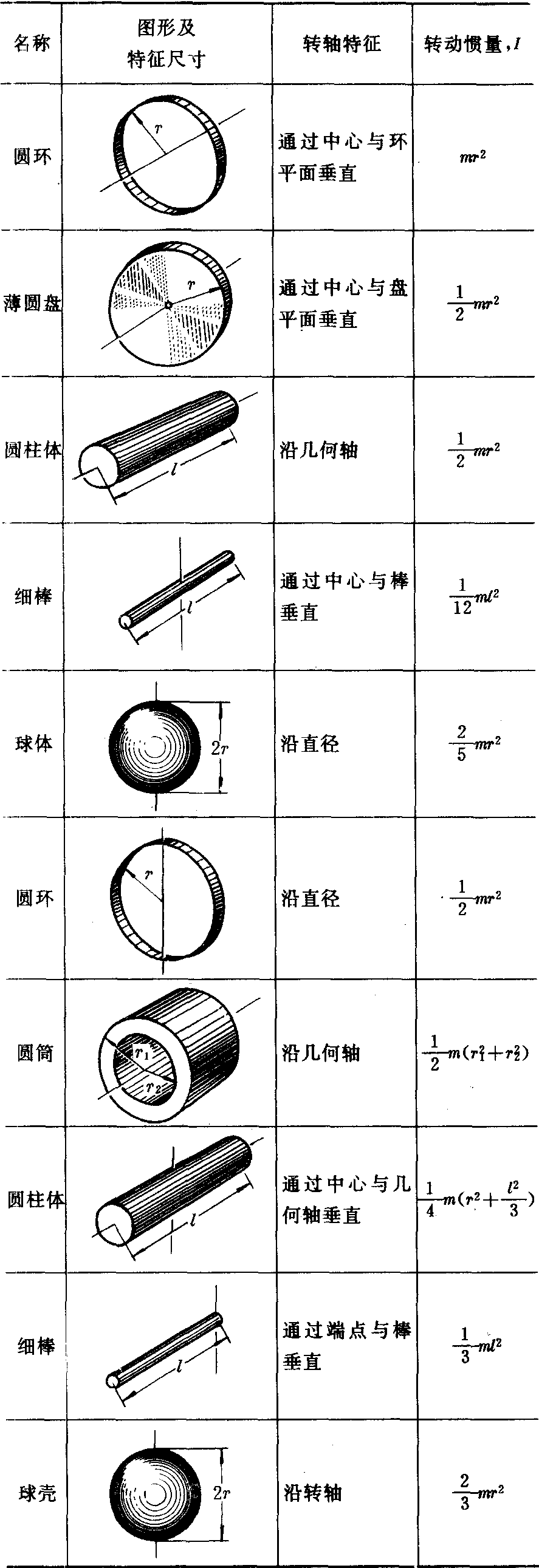 注:表中m为转动体的质量。 ☚ 匀变速定轴转动 平行轴定理 ☛ 转动惯量刚体转动时惯性的量度。它越大,转动状态越不易改变。其大小决定于:1.整个物体的总质量;2.质量的分布情况;3.转轴的位置。规则形状的匀质物体,其质量的转动惯量可直接计算得出;反之则宜用实验方法测定。它的SI单位是kg·m2。 转动惯量moment of inertia |