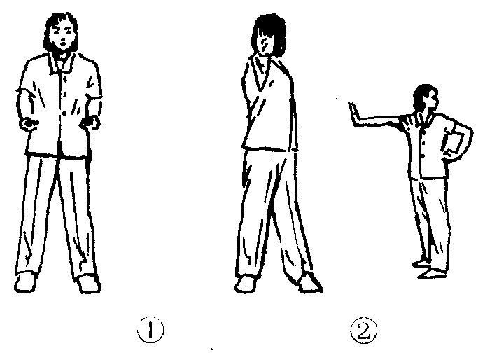 练功十八法第2套第2节。动作过程:两脚分立,略宽于肩,双手抱拳于腰间。(图2—4—128—❶)❶右手立掌向前推出,同时上体向左转90°,掌心向前,眼看左后方,左肘伸向左后方,拳头顶于腰部,两臂成直线。(图2—4—128—❷)❷还原成预备姿势。❸❹动作与❶❷相同,但方向相反。共做4个8拍。注意事项:推掌时用内劲慢推;转腰时上体要正直,两腿要伸直,两臂相对成直线。此功法对肩、背和腰的软组织劳损有一定疗效。