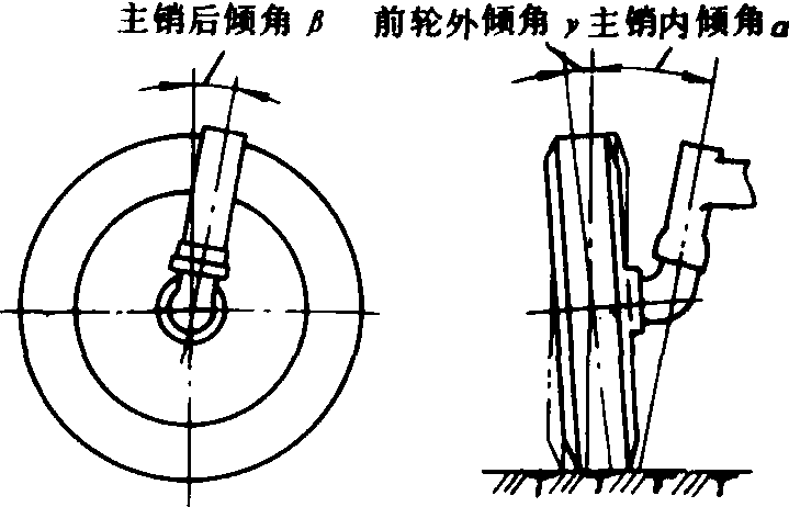 图1 轮式拖拉机前轮转向操纵机构 典型的前轮转向系由方向盘、转向器和一系列杆件组成(图1)。其中横拉杆、转向梯形臂和前轴组成转向梯形。转向梯形的作用是使两前轮偏转不同角度而前后轮轴线会聚在瞬时转动中心,以满足转向时车轮无侧滑的要求。转向梯形有前置、后置两种型式,在某些拖拉机上,采用两根纵拉杆分别带动两前轮以代替转向梯形。在折腰转向拖拉机上,转动方向盘,通过转向器和转向拉杆(转向液压缸)使前、后部机架绕铰销相对转动而转向。转向器常采用减速比大、逆效率低的传动副,以减少操纵力和地面传来的冲击。在功率较大的拖拉机上,采用液压助力转向和静液压转向装置以减轻驶驾员的劳动强度(见拖拉机液压转向装置)。 前轮定位 包括前轮定位角和前束。在前轮转向的拖拉机上,为了提高行驶方向的稳定性,减轻转向操纵力,减少轮胎磨损,转向节立轴(主销)和前轮均按一定的角度安装,包括主销内倾角α、主销后倾角β和前轮外倾角γ,统称为前轮定位角(图2)。两前轮前端之间的间距小于后端之间的间距,二者之差称为前束,可通过调整转向梯形横拉杆获得。其作用是抵偿由于前轮外倾使轮胎与地面相对滑动而产生的偏扭。γ角较大时,前束也取较大值。拖拉机上常用的数值为:α =3°~9°; β =0~5°; γ =1. 5°~4°;前束△l=3~10毫米。