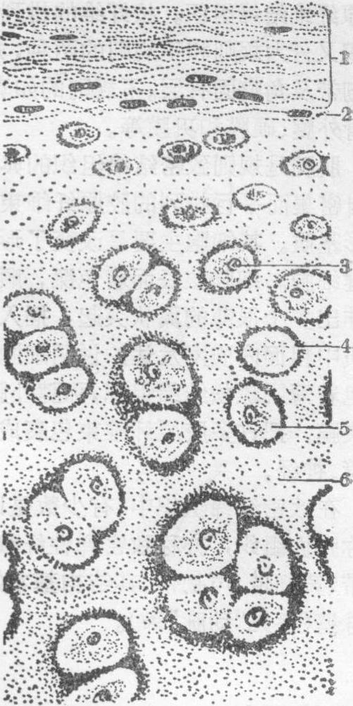 1.软骨膜 2.软骨膜内层细胞 3.软骨细胞 4.软骨囊 5.软骨陷窝 6.软骨基质