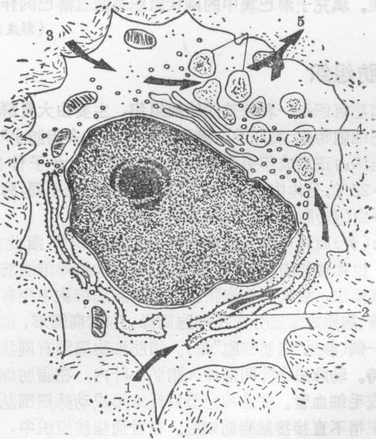 软骨细胞扁圆形或椭圆形,散居于基质的小腔内,容纳细胞的小腔名陷窝。核圆形或卵圆形,有一个或多个核仁,有时可见双核。细胞质通常为弱嗜碱性,细胞生长旺盛时嗜碱性增强,静止的软骨细胞,随其成熟程度而逐渐呈嗜酸性染色。电镜下,软骨细胞形状不规则,表面有许多微细突起。细胞质内显示蛋白质分泌细胞所特有的细胞器,尤其在幼稚的软骨细胞,粗面内质网发达,高尔基复合体明显扩大,其大泡内有颗粒状物质和细小无周期的细丝。细胞表面也有小泡,可能与分泌物排出有关。在成熟的软骨细胞,细胞器不发达,而糖原、脂滴积聚。