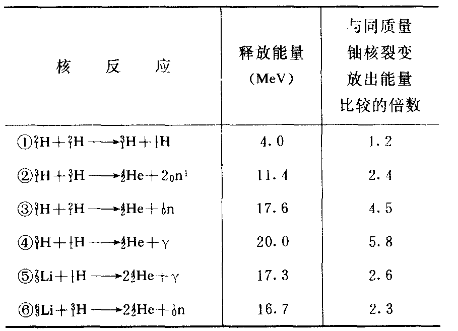| 释义 | 轻核的聚变 轻核的聚变qinghe de jubian轻原子核结合成较重的原子核,同时释放出大量的原子核结合能的核转变。从核子的平均结合能曲线可知,质量数为中等的核的核子平均结合能比轻核的核子的平均结合能大。因此,如果当轻核结合为较重的原子核时,要放出大量的结合能。同重核的裂变一样,轻核的聚变也是释放原子核能的途径之一。根据核子的平均结合能数值,可以计算出聚变反应释放的结合能。例如,当氘核(D或21H)和氚核(T或31H)聚变时将释放△E=7.03×4-(1.09×2+2.78×3)=17.6兆电子伏的能量,反应方程为:21H+31H→42He+10n+17.6Mev。平均每个核子释放3.5兆电子伏的能量。而23592U裂变时放出约220兆电子伏的能量,平均每个核子放出1兆电子伏的能量。显然,相同质量的物质参与反应时,轻核的聚变远大于重核的裂变放出的能量。下表中列出了几个聚变反应与同质量的铀核裂变释放能量的倍数关系。