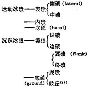 指由于冰川活动而被搬运的碎屑;有正在搬运的冰碛(运动冰碛)和已沉积的冰碛(沉积冰碛)。按照冰碛对冰川的位置,将冰碛作如下划分(国际冰川委员会):