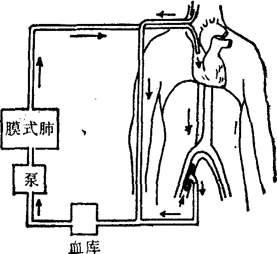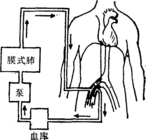 (2)静脉-动脉转流系统示意图 图4 体外循环呼吸支持疗法示意图 氧合后再由颈内静脉送入上腔静脉内。这样使经过肺循环的静脉血含氧量增高,通过心肺后混合均匀,使全身均能获益,特别是有益于冠状动脉及脑动脉的循环。同时肺动脉及支气管动脉内血氧高,有利于损害肺的恢复。但此法的突出缺点是不减轻左、右心及肺循环的负荷; 再者,因灌注血均经过肺、由体外循环所带来的大小颗粒均会对肺毛细血管产生损伤。❷静-动脉转流(图4(2))把由腔静脉引流出的血液通过膜式肺氧合后,从股动脉或主动脉根部送入体内。这种氧合血液的分布区域大小要看动脉血送回体内部位的高低和灌注量的大小而异。部位高,流量大则分布区域广,氧合血可以到脑血管及冠状动脉;若是送到腹主动脉内,则仅下半身得到氧合较好的血流,上半身及冠状动脉则得不到。 此法的优点是它减少了左、右心室以及肺循环的容量负荷和右室的阻力负荷,有利于肺损伤的恢复。 ❸静-动脉及静-静脉混合转流系在静-动脉灌注的基础上,又将一根导管经右颈内静脉插入上腔静脉或右心室内,其目的是把一部分氧合血送至右心,这样有利于氧合血的合乎生理的分布。 适应证 目前尚没有成熟的适应证作为临床应用的依据。一般认为 ❶肺有严重疾患,经最大限度治疗如气管切开及采用呼气末正压机械通气及循环支持疗法无效,动脉血氧张力持续低于50毫米汞柱者。 ❷心血管状态持续恶化。 ❸中枢神经症状进行性恶化。 ❹生存机会在成人只有20%,小儿只有10%,新生儿只有5%等情况下,方考虑用体外循环呼吸支持。 禁忌证 ❶脑挫伤或有出血不能应用抗凝者。 ❷肺部病变超过21天已造成严重破坏者。 ❸只能延长生命而病变不能逆转者均不用。 ☚ 体外循环与人工心肺机 心脏手术时心肌保护 ☛ 辅助循环 辅助循环assisted circulation指用机械的方法代替心脏的功能,以维持血液循环的治疗措施。目前临床常用辅助循环方法有人工心肺机转流、主动脉内气囊反搏、左心转流及人工心脏装置等。辅助循环可部分或完全代替心脏工作,维持全身有效的血液循环,增加心肌血供,促进心脏功能恢复。其主要用于先天或后天性心脏病的心内直视手术中及各种类型的心力衰竭药物治疗不满意者。 ☚ 基础紧张度 导联 ☛ |