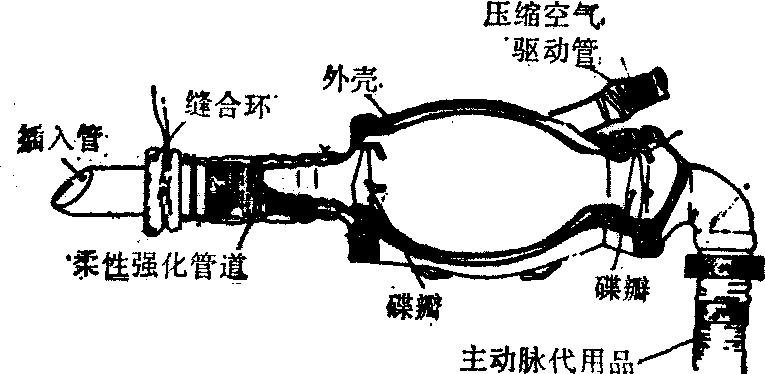 图2 部分左心转流 助装置进行,1971年De Bakey首先成功的应用左室辅助装置为二例心内直视手术后有低心输出量病人进行了左心转流。Pieres等应用左心辅助装置进行了左心转流治疗,病人的存活率达50%以上。近数年来,Norman又研制了可以埋藏在腹腔内的左心室辅助装置,它是一个单腔带活瓣的泵(图3),与外界同步的或非同步的气动装置相连,其两端管道分别与左心室尖部及肾动脉下方腹主动脉的侧壁相连接。临床上21例病人应用了此种装置,最长的用到一周,仅有2例脱离了此种装置。适应证 左心室功能不全伴有 ❶不易治疗的充血性心力衰竭。 ❷心脏显著扩大。 ❸左心室收缩力广泛障碍。 ❹左心室舒张末压≥20mm汞柱。 ❺心脏指数每平方米小于2.5L/min,应用IABP无效者。
