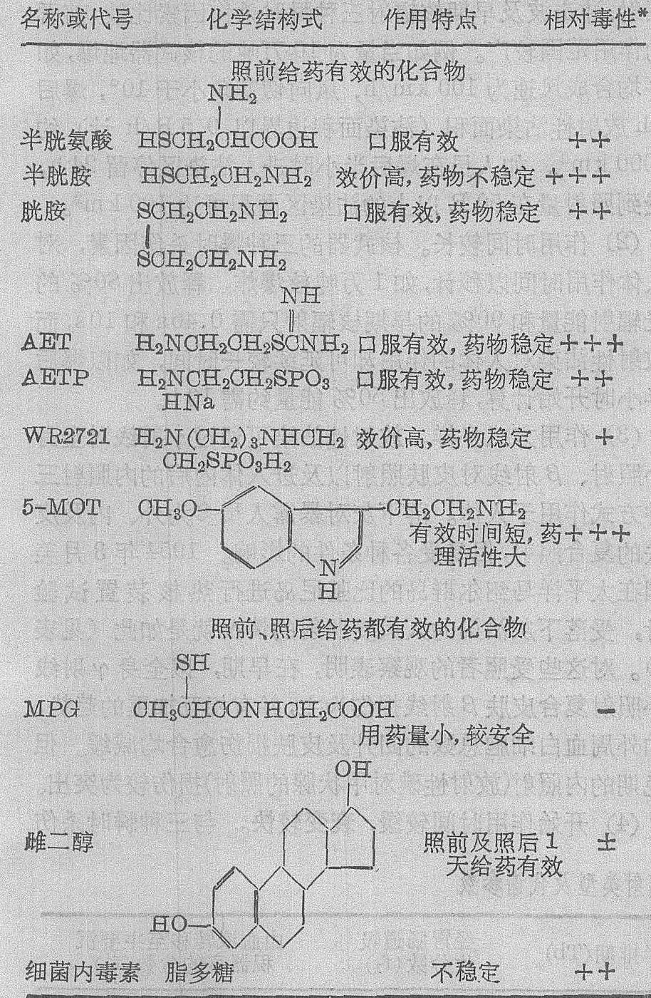 | 释义 | 辐射损伤的化学防护 辐射损伤的化学防护辐射损伤的化学防护或称药物防护,是指机体受电离辐射前给予某种化学物质(或药物)能减轻机体的辐射损伤,促进其恢复,从而提高受照射机体的活存率。具有这种作用的化合物或药物,一般称为辐射防护剂,也有人将其称为“抗放药物”或“抗辐射药物”。近年来发现照后早期给予某些物质,也能促进辐射损伤的恢复,提高活存率。这与针对放射病的临床症状所采取的治疗措施不同,有人主张这也属于辐射防护剂的范畴。 主要辐射防护剂